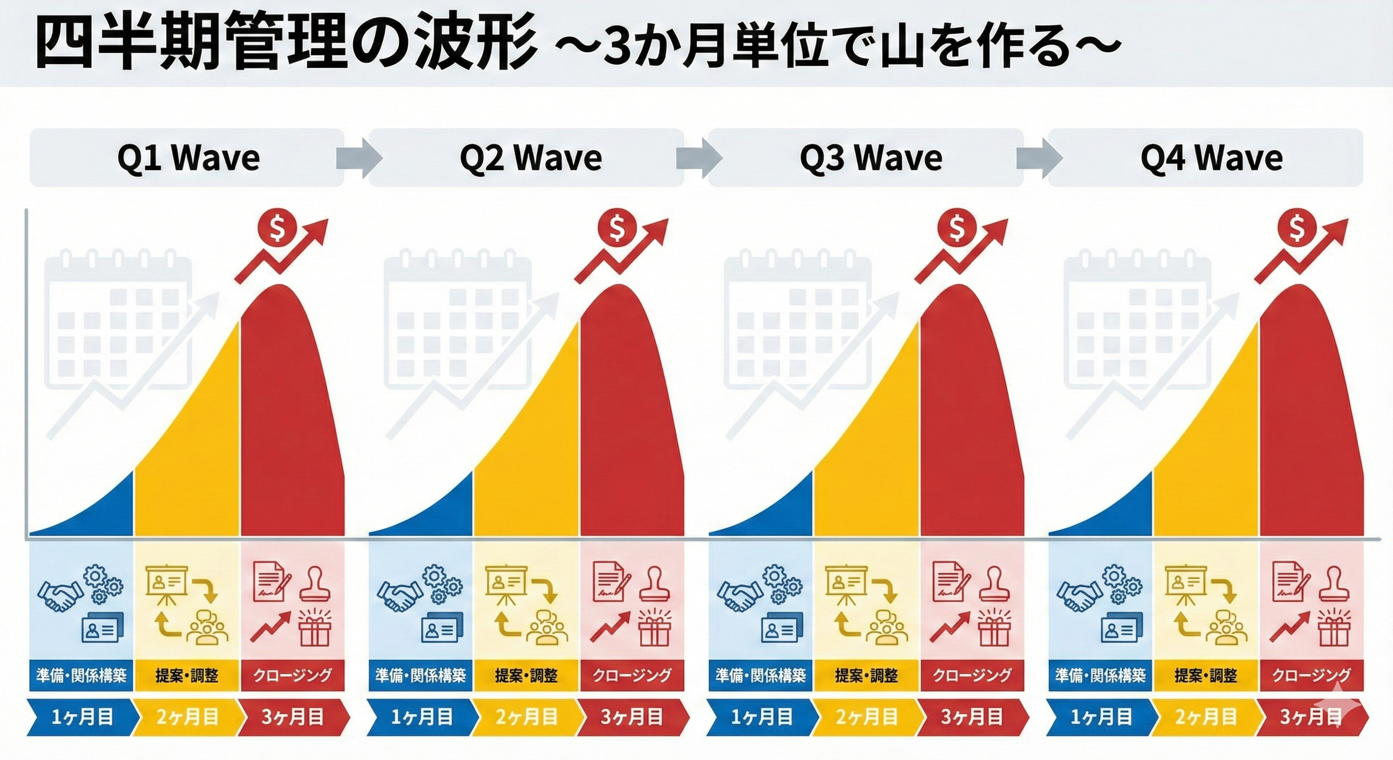 | 四半期 | 3か月 | 短期と中期のバランス | 営業目標管理, PDCA, 評価 |