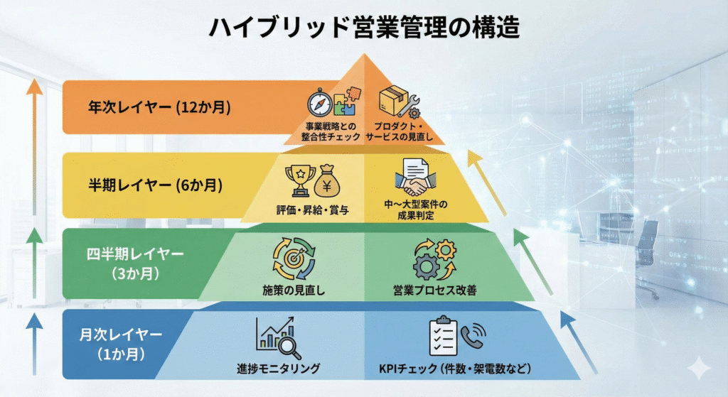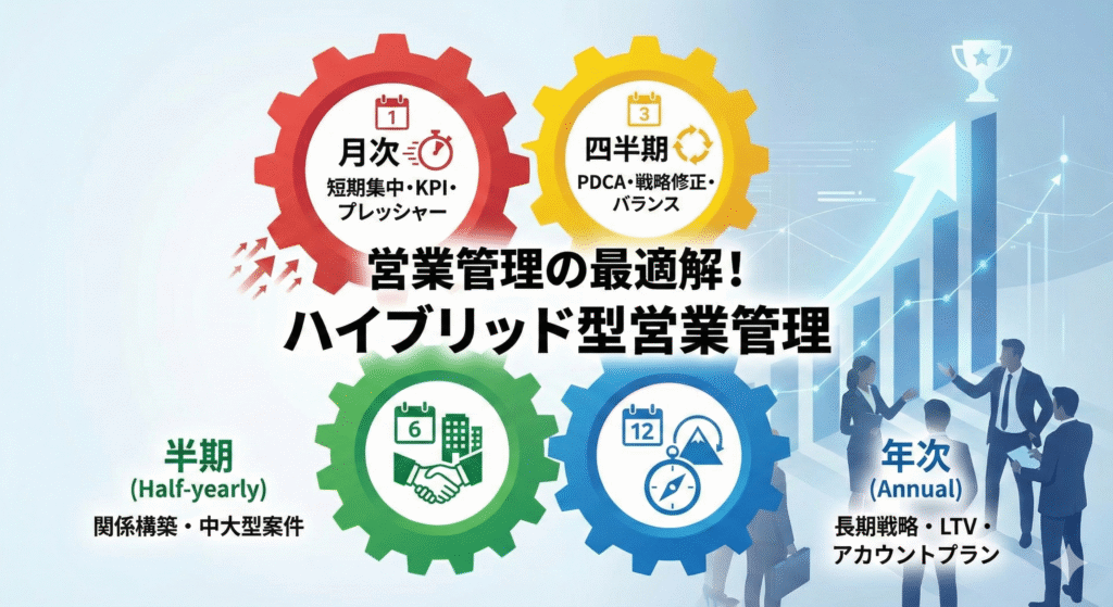 本記事では、SEOを意識しつつ、 「半期・四半期・年次・月次」それぞれの特徴と、ハイブリッド営業マネジメントの設計方法 を図解付きで解説します。
