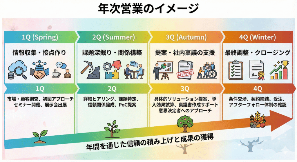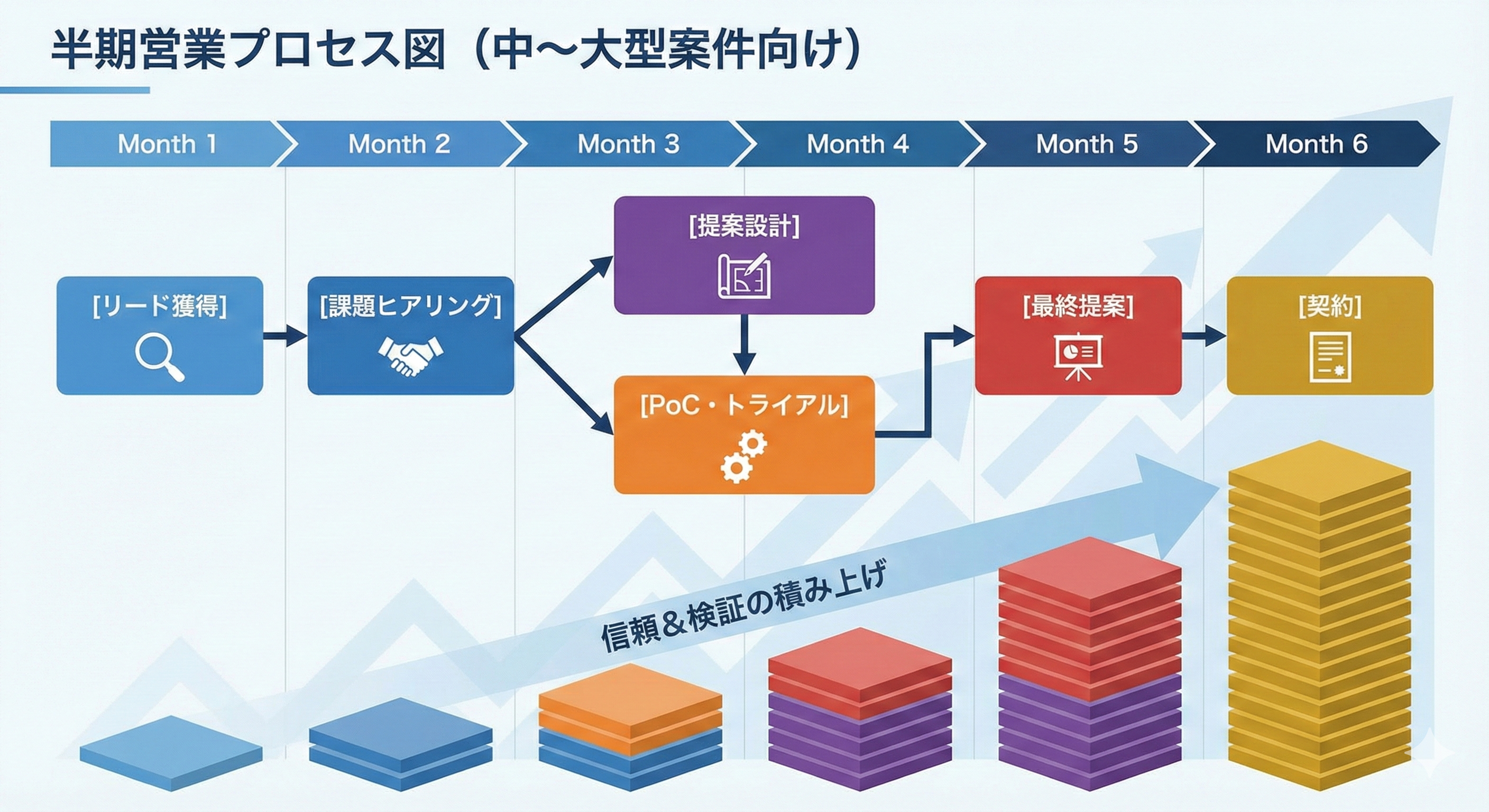 | 半期 | 6か月 | 中〜大型案件・新規開拓 | 関係構築, フィールドセールス |