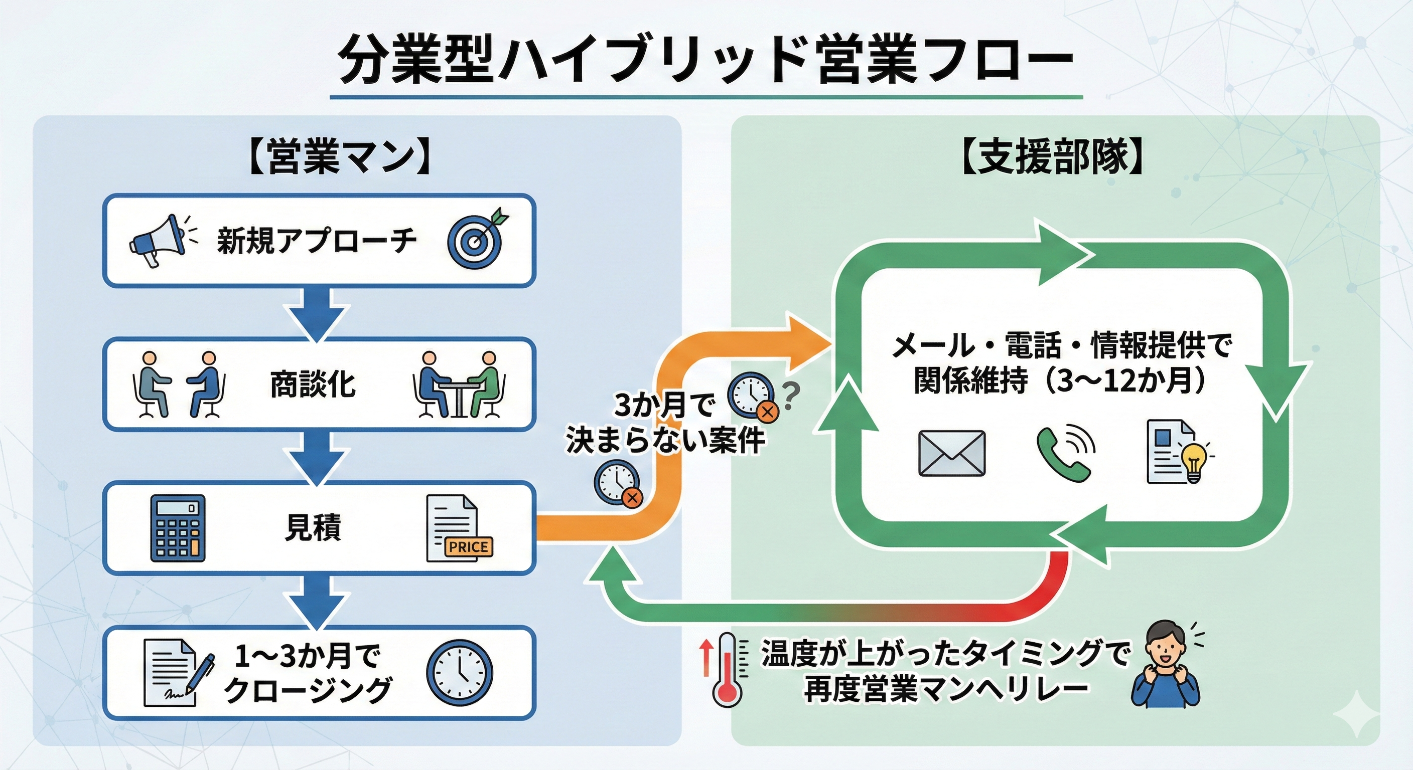 特におすすめなのは、「現場営業」と「支援部隊」を分業し、時間軸を分けて管理する設計です。
